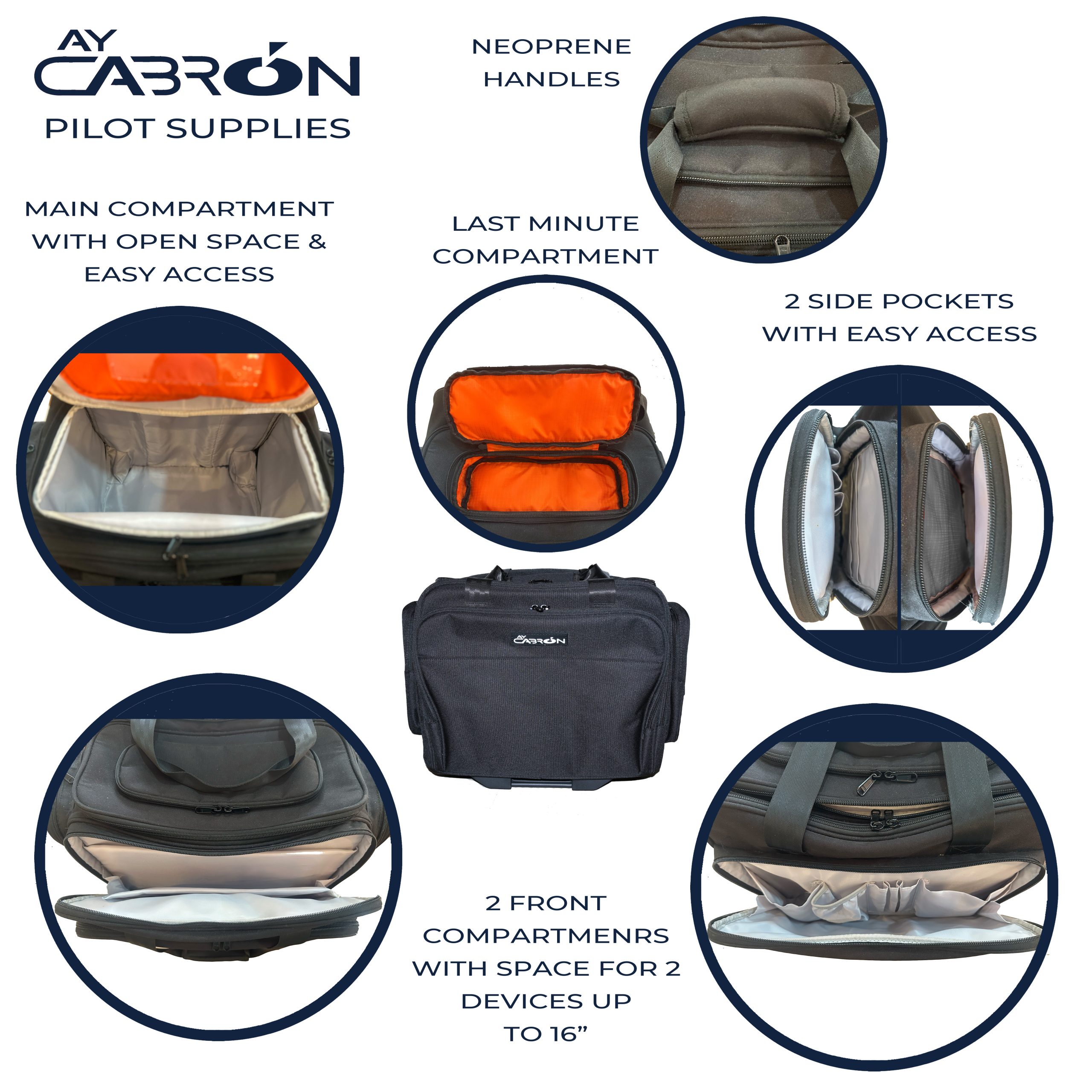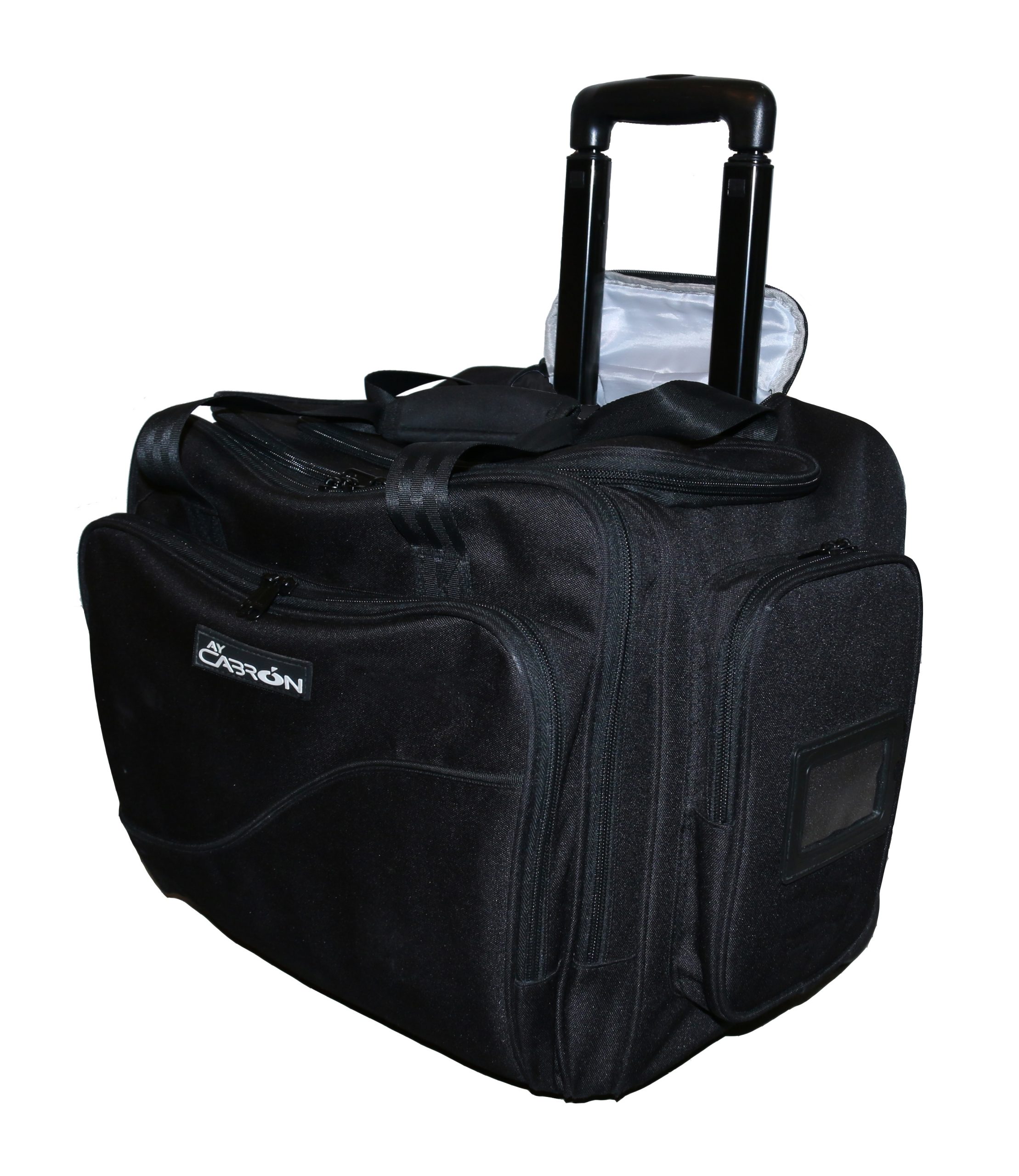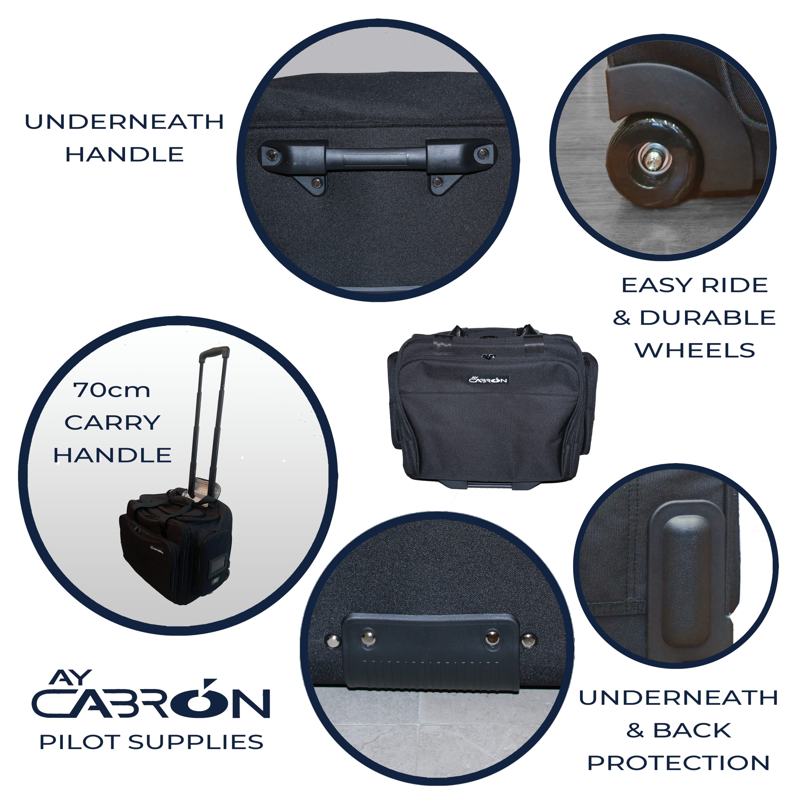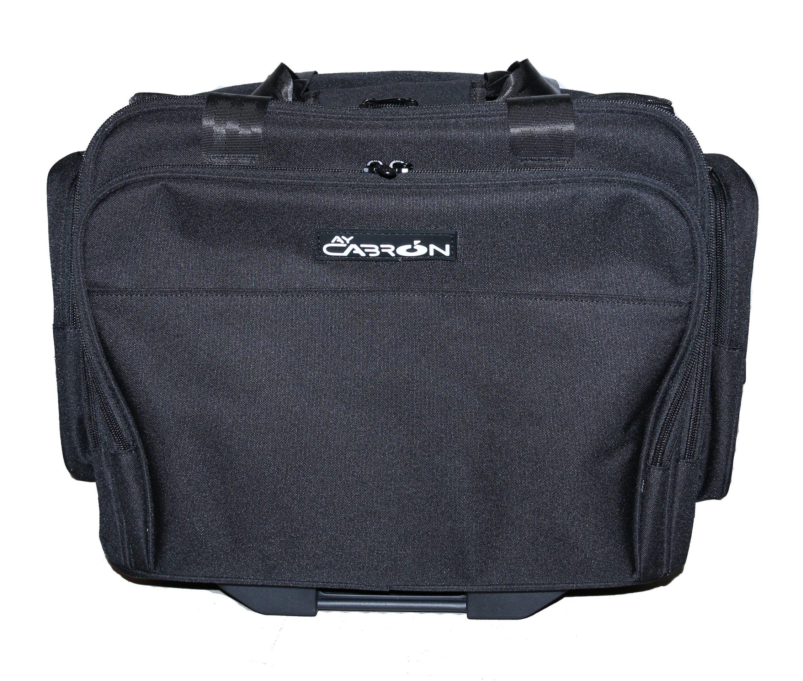 🧳 PERFECT FIT – Fits under airplane seats and overhead storage compartments, making it the ideal companion whilst traveling. Ideal size for Boeing or Airbus Flight Deck. 🧳 LONG-LASTING AND PREMIUM FABRICS – Water resistant and strong material construction. Rigid case for added durability. Leak resistant main compartment. Fabrics and stitches are long lasting but soft to touch. Ay Cabron trolley bag was tested for more than 250km and 20kg of weight without failures. 🧳 FRONT COMPARTMENTS – Two front storage compartments with sleeves and pockets for laptops, EFB, tablets, clipboards, document files, wallet, phones, pens, toiletries, etc. The electronic compartment provides excellent protection and sufficient ventilation for any device. Up to 16 inches laptops and 15 inches tablets. 🧳 SIDE COMPARTMENTS – Two side storage compartments with quick access for official documents, passport, cables, chargers, sunglasses, etc. 🧳 MAIN COMPARTMENT – The main compartment provides open space and perfect size for all needs and requirements, the area is leak proof and the lid opens from top which makes it accessible even for large articles like headsets, sunshades, clothes, shoes, etc. 🧳 TOP COMPARTMENT – Last minute compartment ideal for ID, badges, ties, spectacles, mobile phones, etc., making it a unique design in the market. 🧳 MOBILITY – Easy rolling wheels but high durability, long telescopic handles for easy carrying, underneath handle to provide effortless lifting to place it on top of desks and security checkpoints. 🧳 DESIGN – Designed for pilots but can be used by Travelers, Office Personnel, Sales Representatives, etc. and tested under the most adverse conditions. 3.5kg making is the lightest trolley flight bag in the market. 42cm wide 33cm tall 25 depth